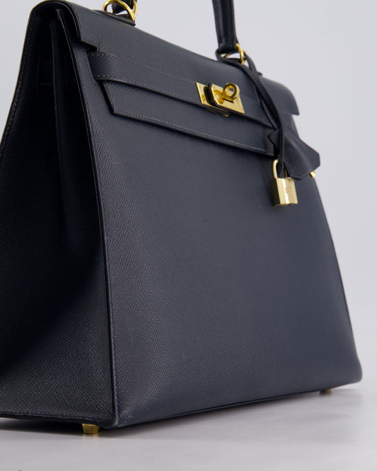 Hermès Vintage Kelly Sellier 35cm Bag in Blue Indigo Courchevel Leather with Gold Hardware