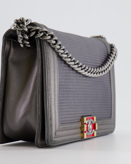 Chanel Grey Silver Medium Cube Calfskin Boy Bag with Silver, Gold and Red Hardware Hardware