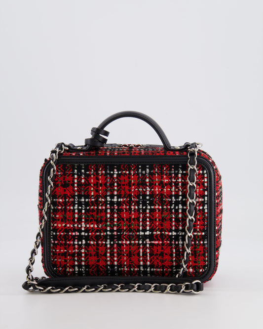 Chanel Black and Red Medium CC Filigree Vanity Case Bag in Tweed with Silver Hardware and Chain Detail