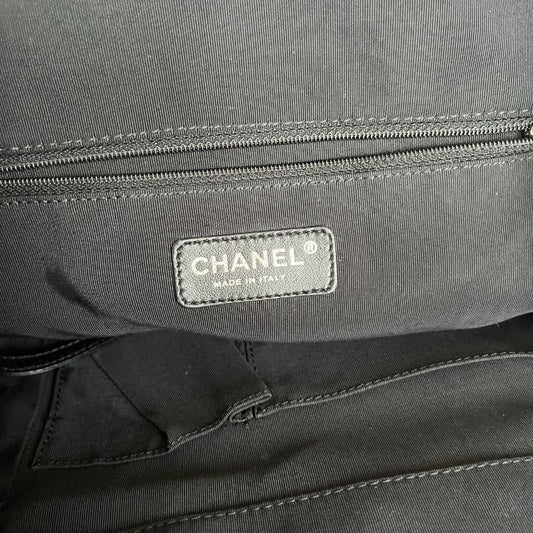 *HOT* Chanel Black Small Deauville Tote Bag in Shiny Calfskin Leather with Antique Gold Hardware and Pearl, Crystal Logo Detail