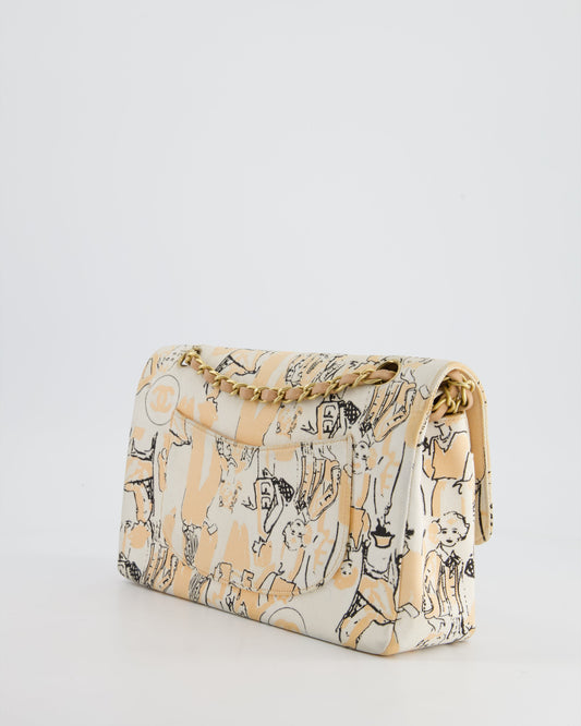 Chanel Peach and White Vintage Coco Print Classic Medium Double Flap Bag in Fabric with Brushed Gold Hardware