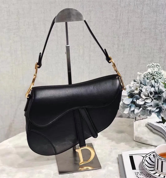 Dior Vintage Ostrich Black Leather Saddle Bag With Gold Ornaments