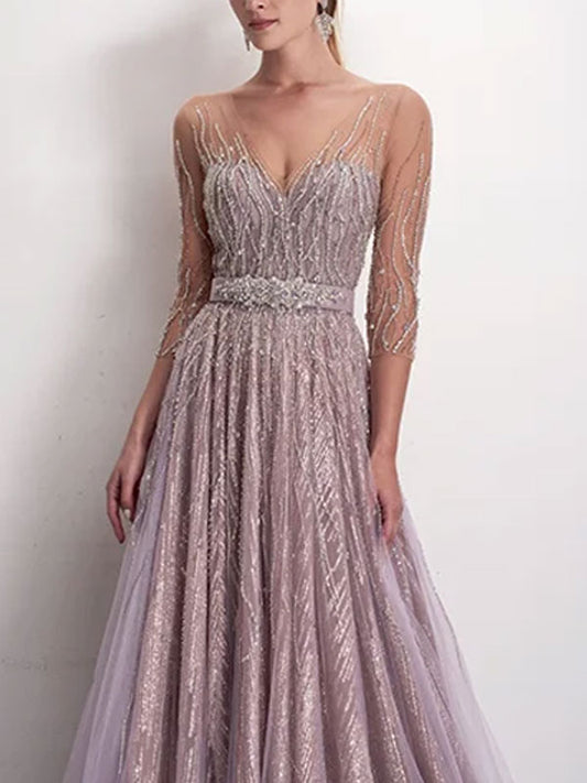 V-neck Sequined Mesh Solid Color Maxi Dress