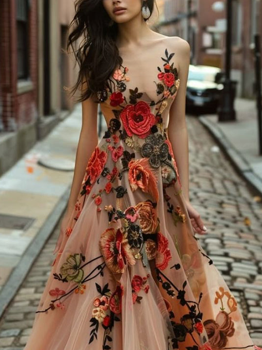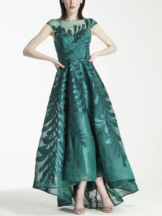 Evening Formal Gown Tulle Foil Fabric Cape Boat Neck Maxi Dress