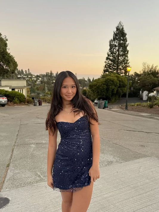 Navy Blue Spaghetti Straps Short Shinny Party Dress Homecoming Dress cg25662