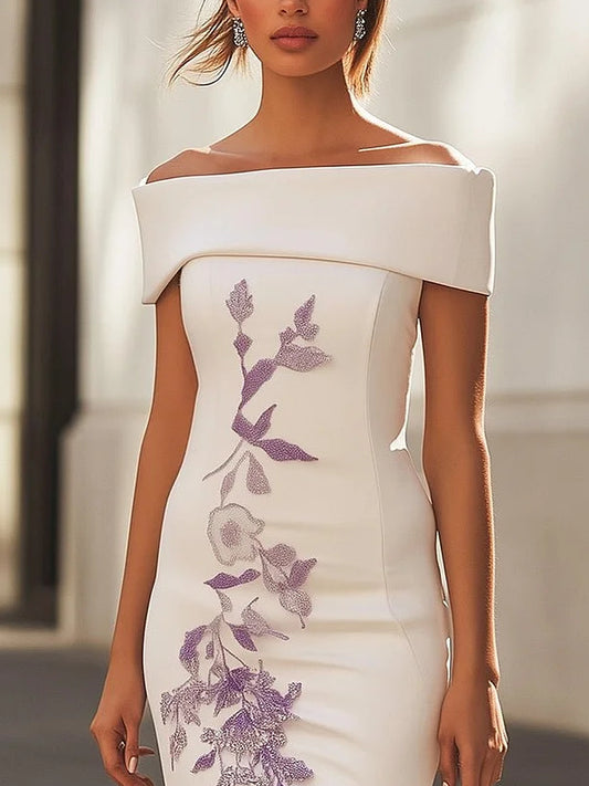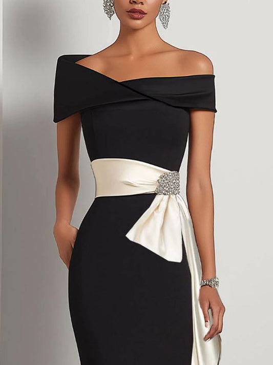 Elegant Evening Satin Dress Off-Shoulder Mermaid White Sash Rhinestone Dress