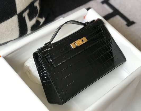 H MINI KELLY POCHETTE CROCODILE GOLD TONED HARDWARE BLACK 22CM