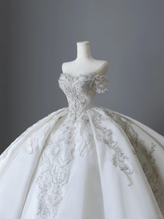 Shiny satin heavy rhinestone beaded vintage floor-length wedding dress P2507