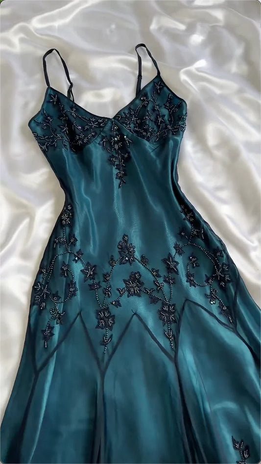 Red Vintage Elegant Delicate Floral Sequin Beading Spaghetti Straps Floor Length Formal Satin Lace Evening Dress Birthday Party Dress Prom Dress gh3832