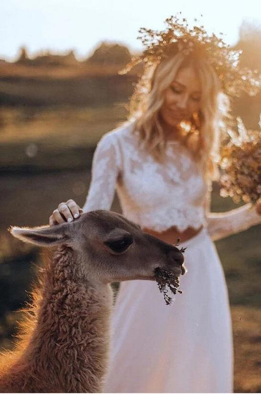 Affordable Casual Long Sleeve Lace Top Bridal Dresses,Rustic 2 Piece Crop Top Wedding Dress
