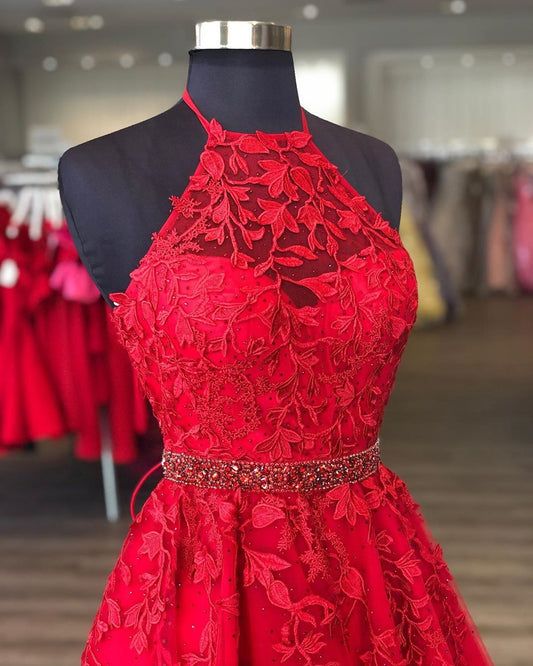 Halter Neck Short Red Lace Prom Dresses, Short Red Lace Formal Homecoming Dresses