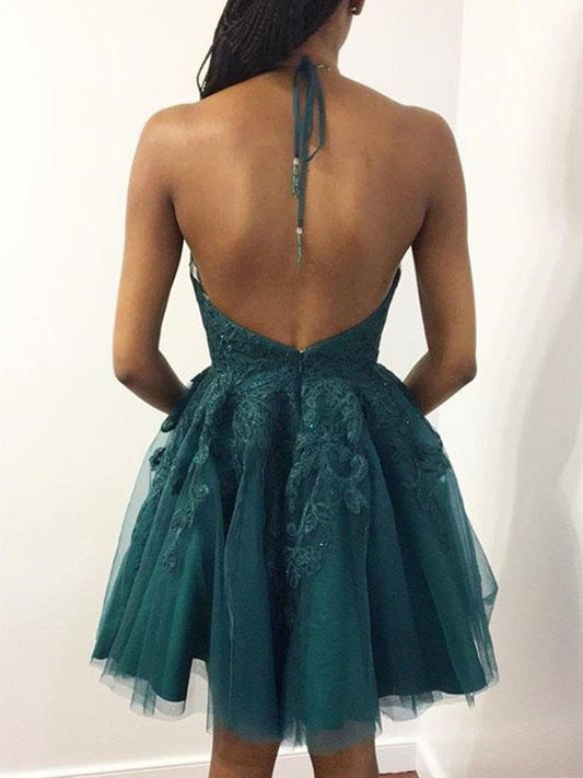 Halter Neck Short Emerald Green Lace Prom Dresses, Short Green Lace Graduation Homecoming Dresses