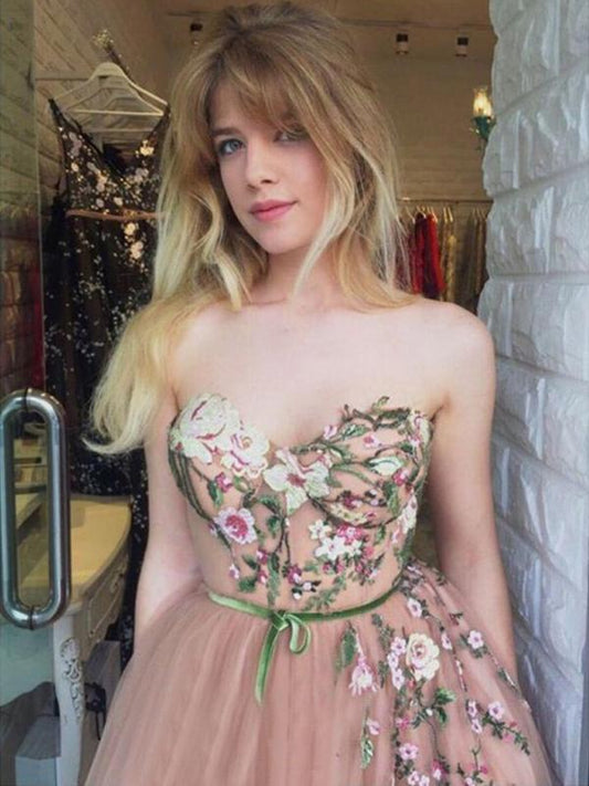 Sexy Dusty Pink Sweetheart Strapless Lace Top A-line Long Prom Dress