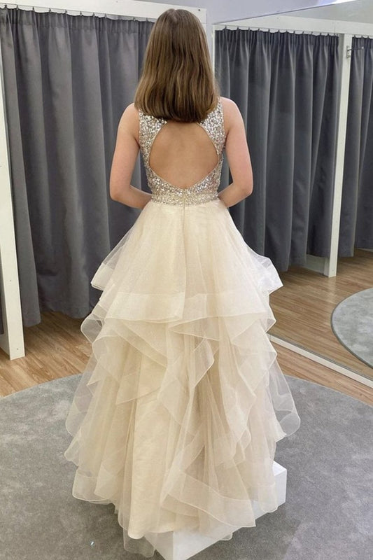 Gorgeous Open Back Beaded Fluffy Long Prom Dress, Graduation Gown