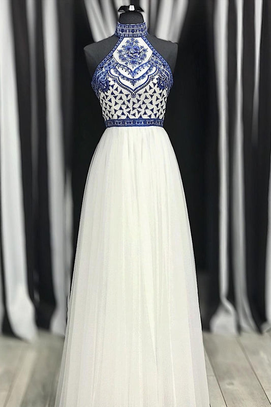 High Neck White Blue Embroidery Long Backless Prom Dress