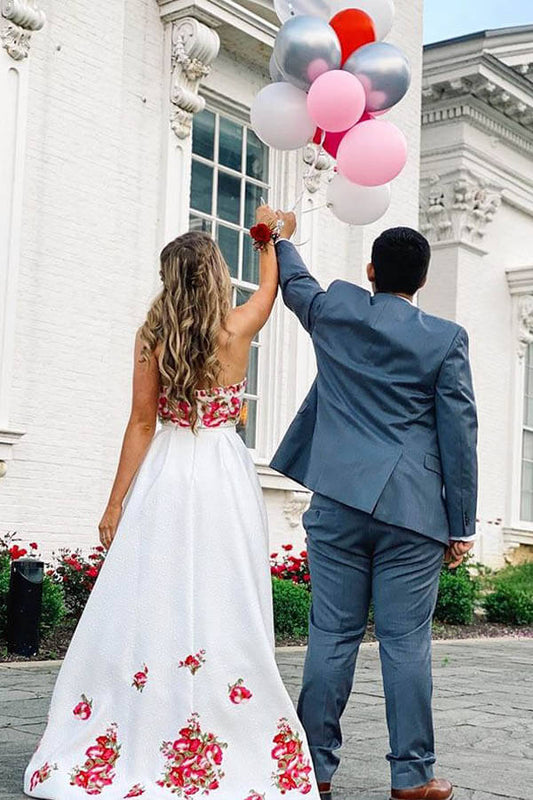 Colorful Embroider High Low Halter Two Pieces Long Prom Dress