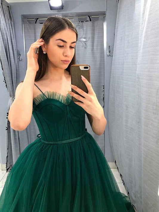 Dark Green Tulle A Line Spaghetti Straps Long Prom Dresses, Evening Gowns