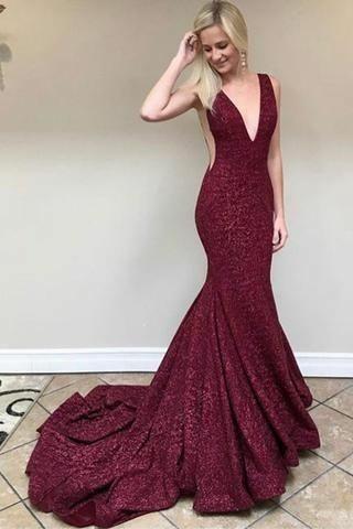 Glitter Sequin Burgundy Evening Dress Mermaid Train