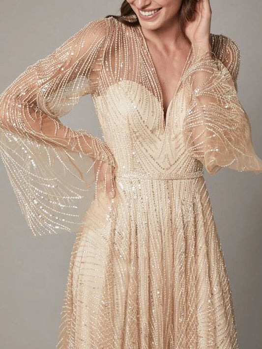 A-Line/Princess V-Neck Half Sleeves Long Formal Evening Dresses With Beading
