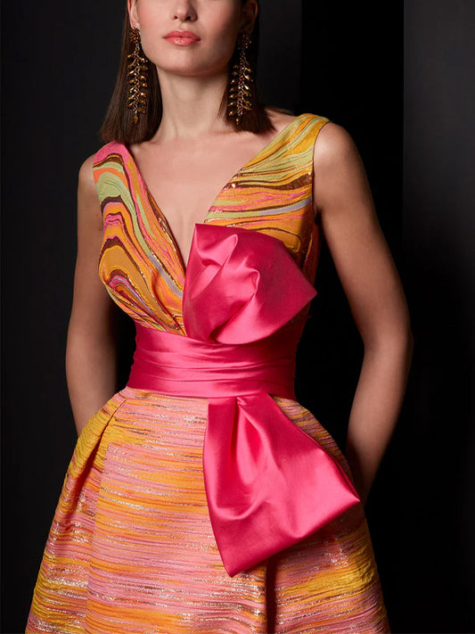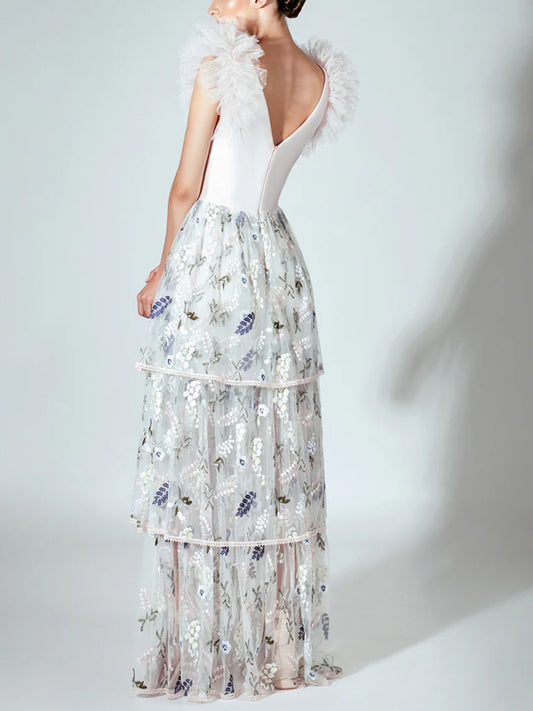 V-Neck Lace Sequin Solid Color Maxi Dress