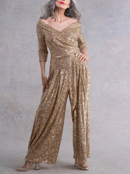 V-Neck Solid Sequined Long-Sleeved Jumpsuit