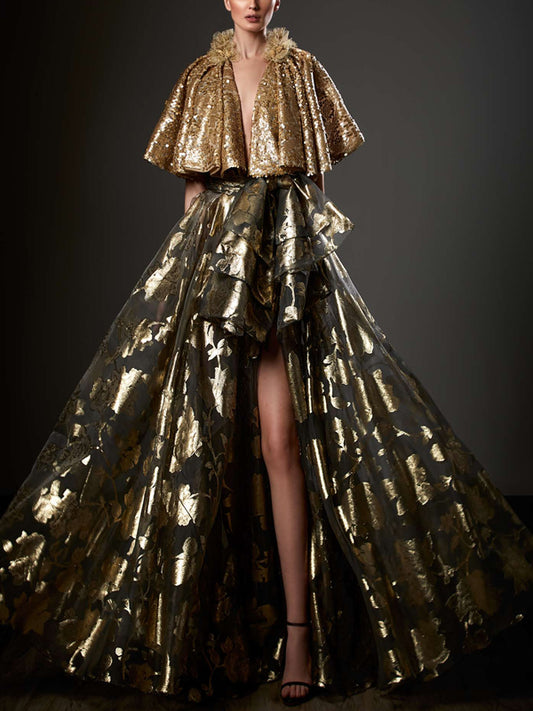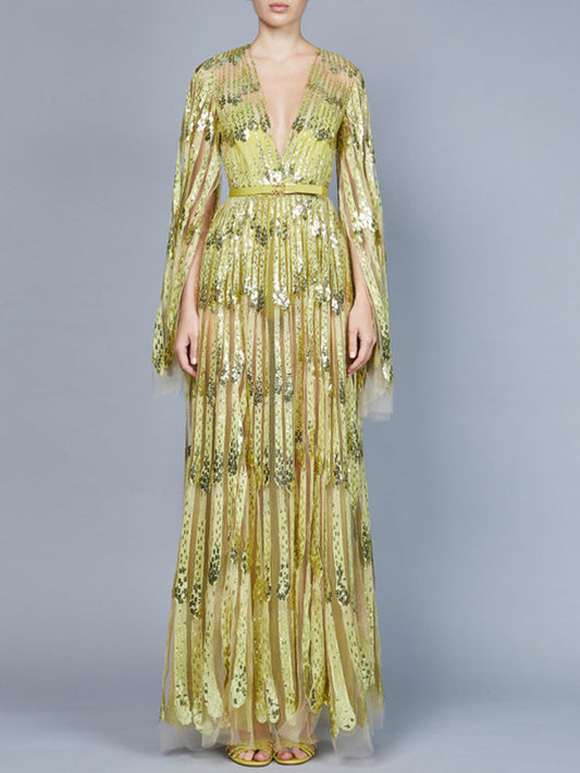 V-neck Solid Color Sequins Maxi Dress