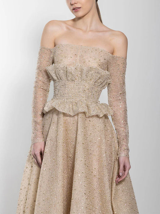Off-shoulder Sequin Solid Color Maxi Dress