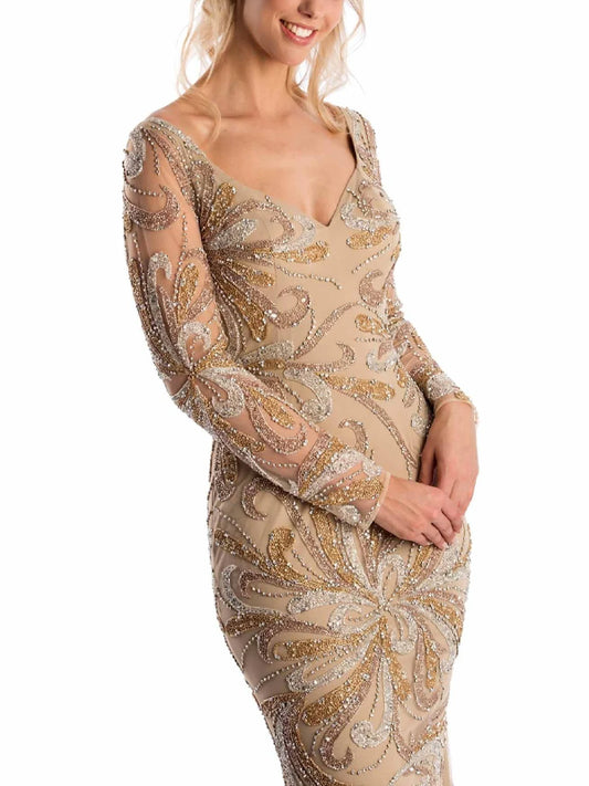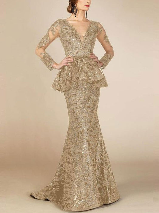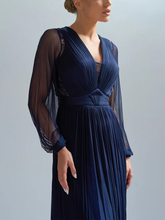 V-neck Long Sleeve Lace Solid Color Maxi Dress