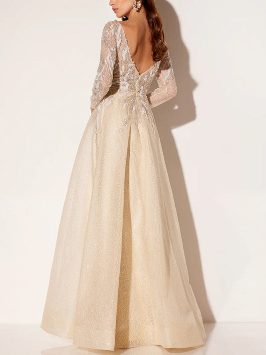 V-neck Solid Color Mesh Long Sleeves Maxi Dress