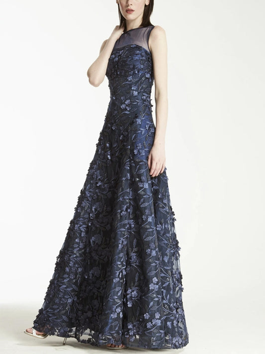 Round Neck Mesh Lace Solid Color Maxi Dress
