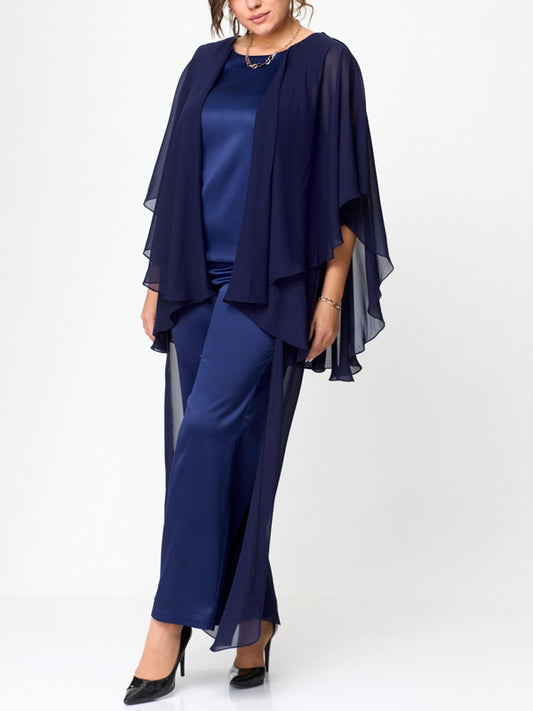 Round Neck Solid Color Chiffon Top And Trousers Suit