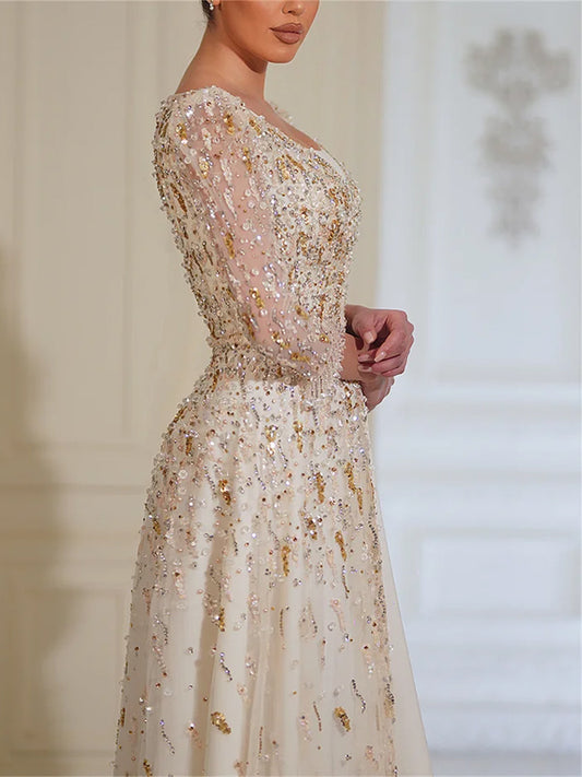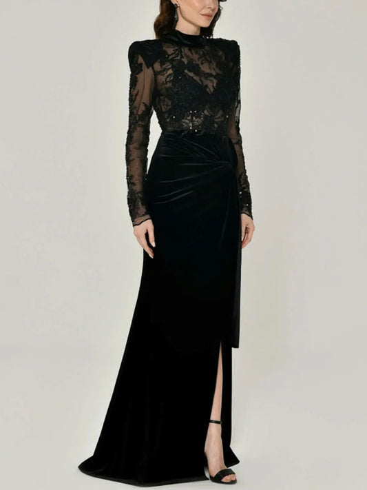 Sequined Mesh Solid Color Long Sleeves Maxi Dress