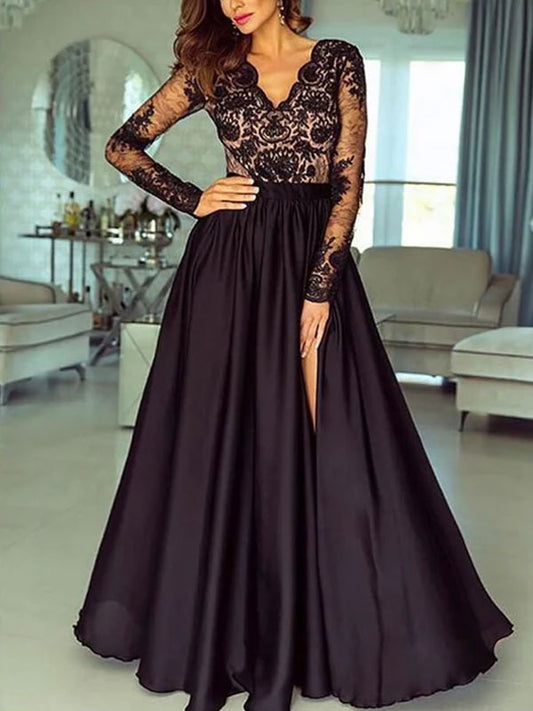 V-Neck Solid Color Lace Sequins Maxi Dress