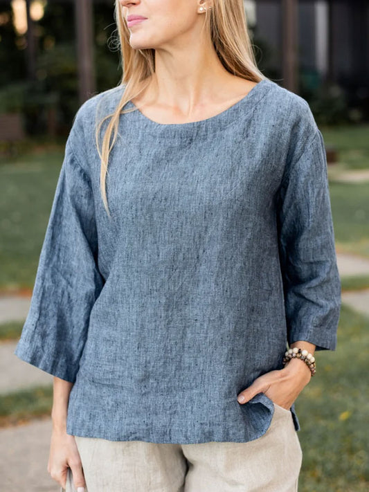 Pullover Solid Color Cotton and Linen Ladies Shirt