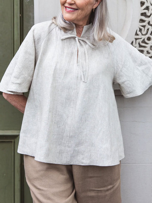 Lace-up Cotton and Linen Stripes Short Sleeves