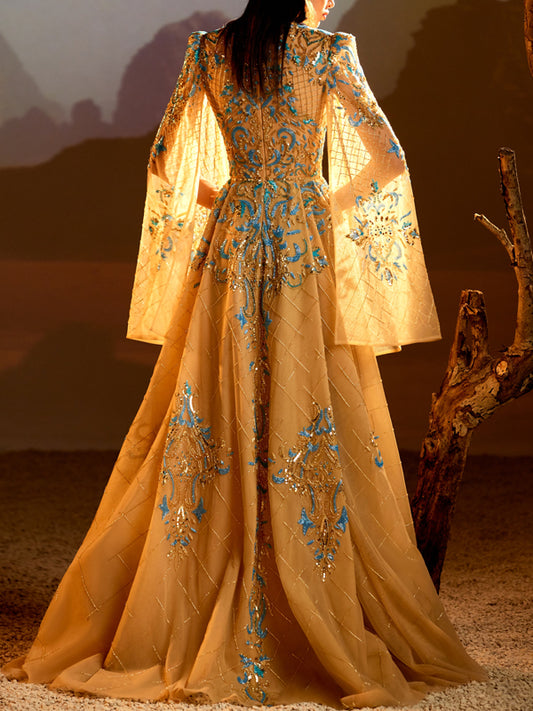 Round Neck Feather Sequin Long Sleeves Maxi Dress