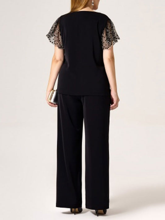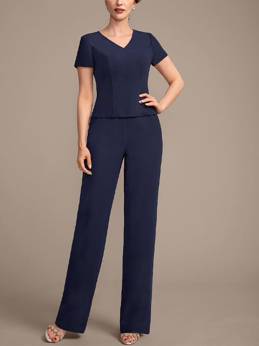 V-Neck Solid Color Short-Sleeved Top And Trousers Three-Piece Suit