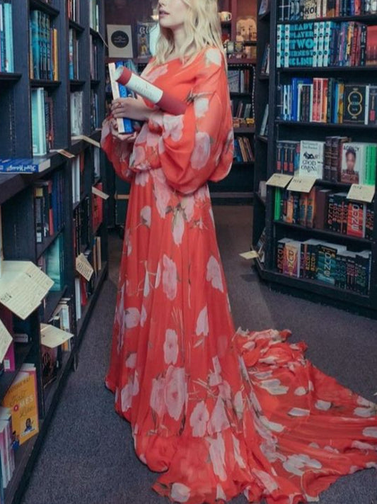Elegant Floral Printing Sweetheart Neckline Maxi Dress