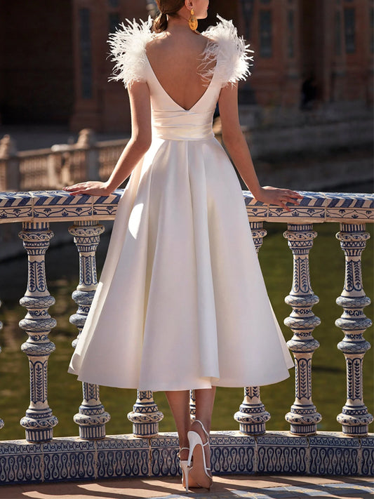 V-neck Solid Color Feather Midi Dress