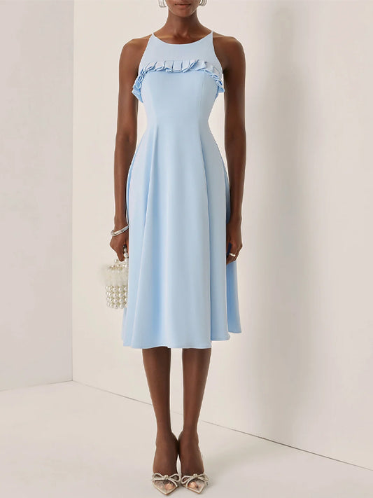 Light Blue Peplum Classic Spaghetti Sleeveless A-Line Midi Dress