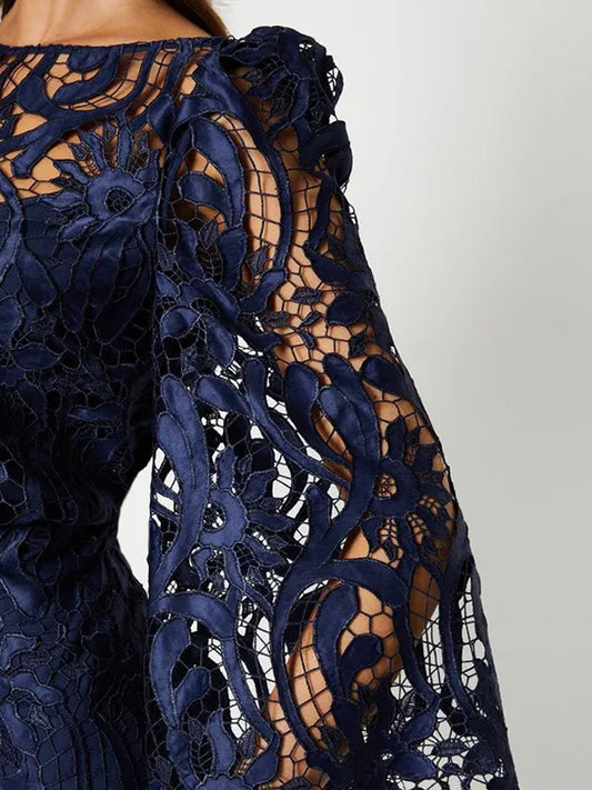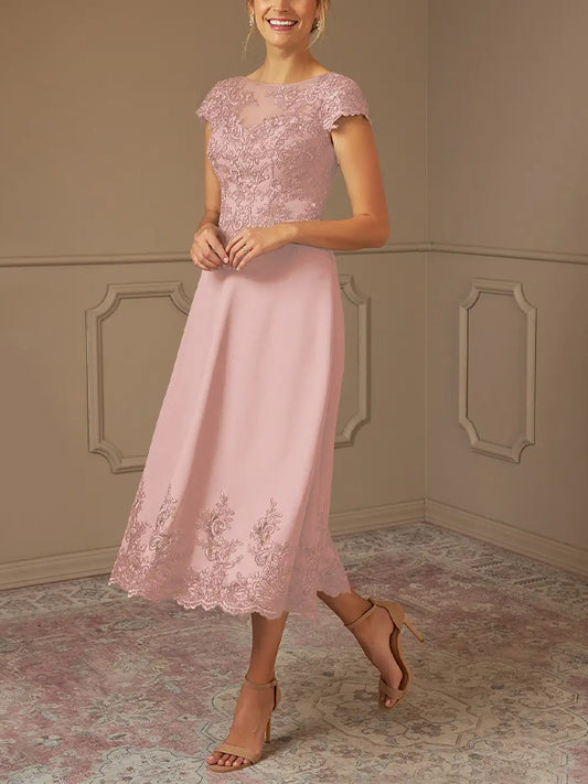 Round Neck Lace Short Sleeve Solid Color Midi Dress