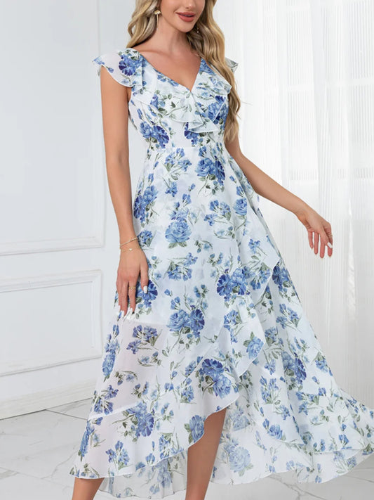 Ruffle Floral Print V-Neck A-line Chiffon Asymmetrical Midi Dress