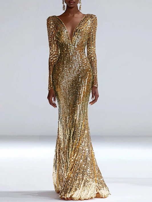 V-neck Sequined Long Sleeves Maxi Dress