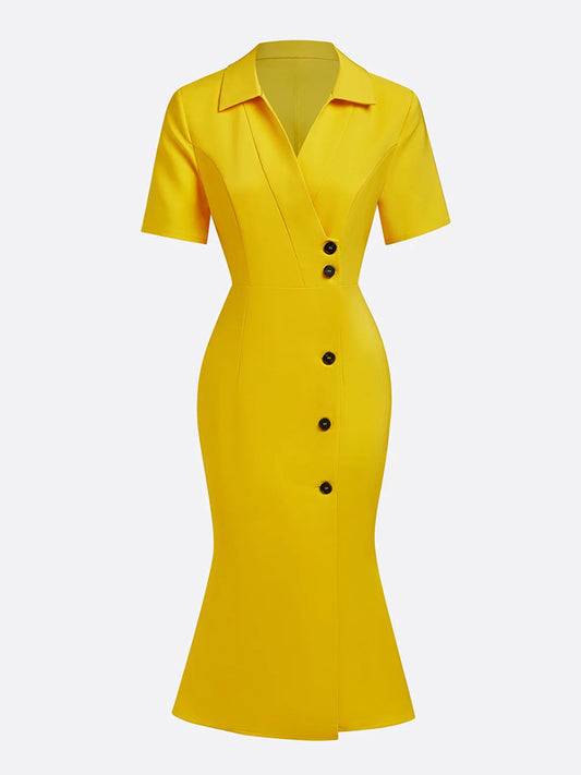 Elegant Plain Short Sleeve Buttoned Shawl Collar Midi Dress