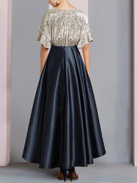 Round Neck Sequined Short Sleeve Solid Color Maxi Dress