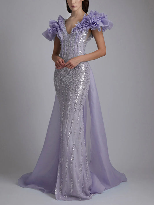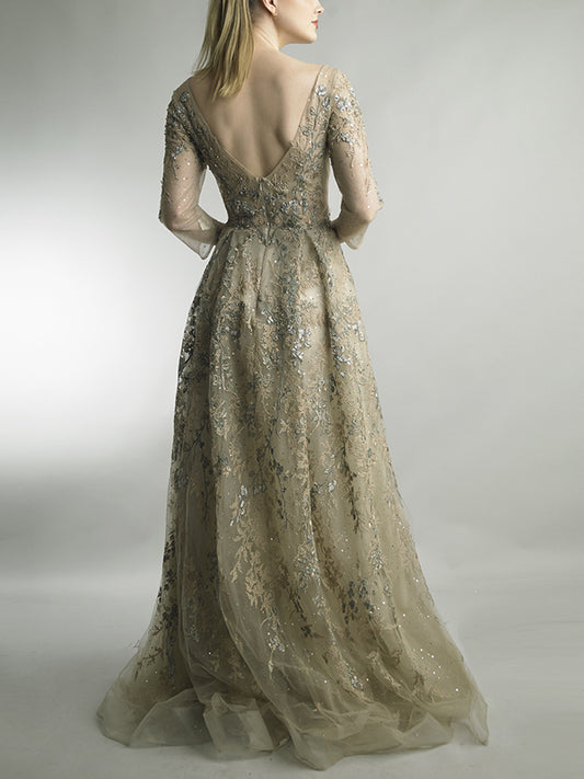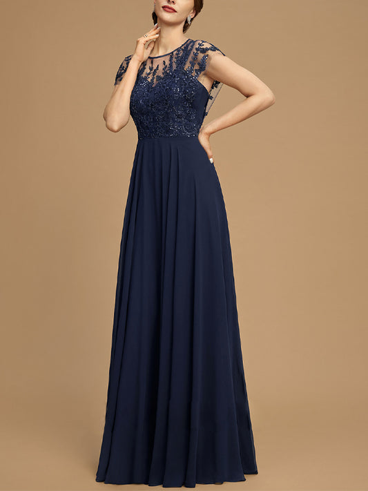 Round Neck Lace Sequins Solid Mesh Gown Maxi Dress