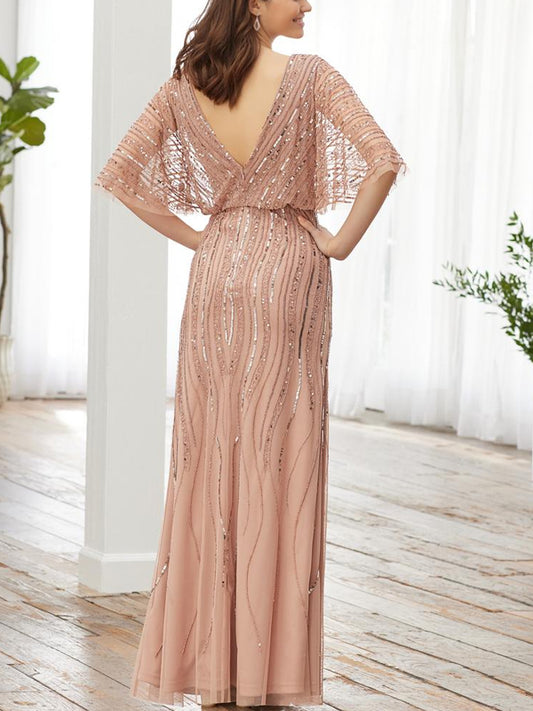 Round Neck Lace Short Sleeve Sequins Pure Color Mesh Gown Maxi Dress