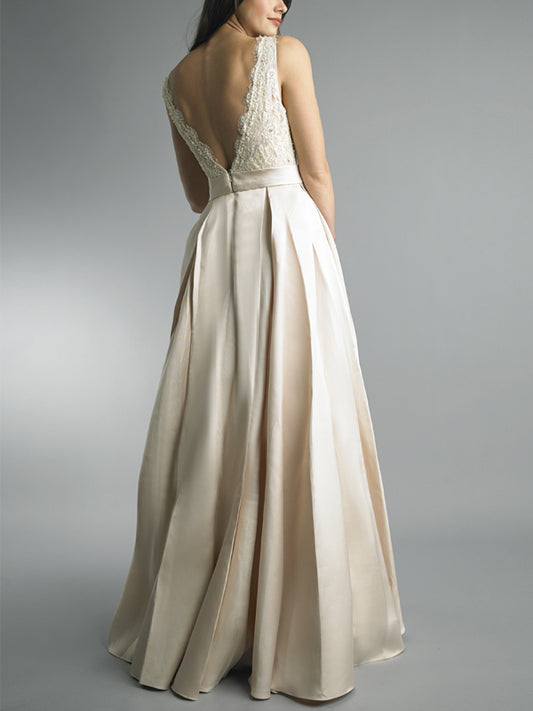 V-neck Lace Solid Color Mesh Gown Maxi Dress