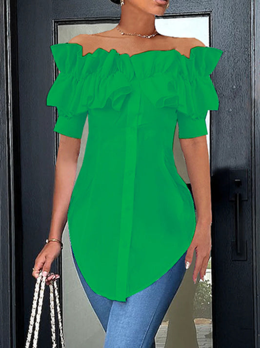 Elegant Off Shoulder Ruffle Short Sleeve Button-Down Blouse