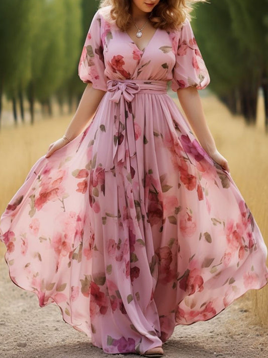 Floral V Neck Lantern Sleeve 3/4 Sleeve See Through Pocket Chiffon Maxi Dresses